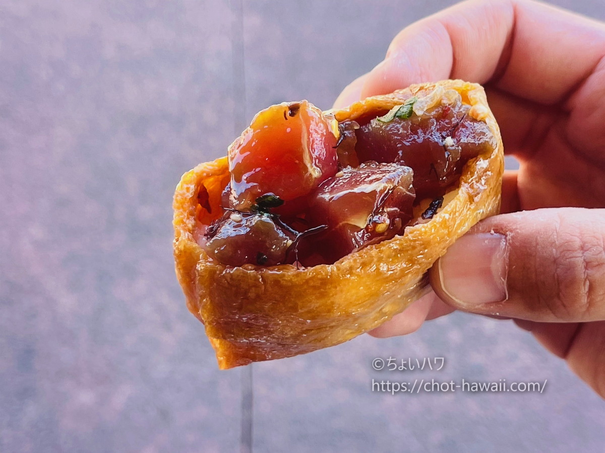 とりあえず、マツヤママーケットで買った「アヒポキいなり」で軽く腹ごしらえ。