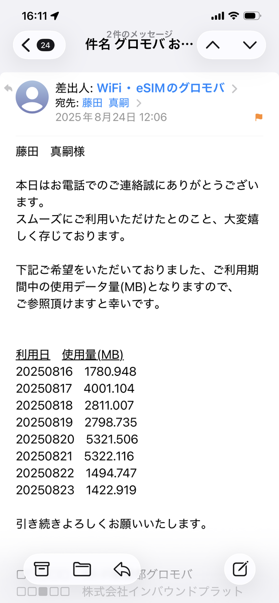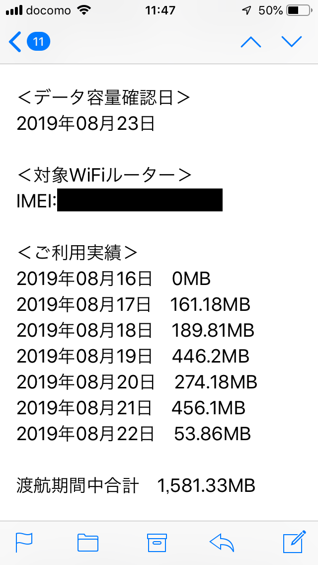 レンタルWi-Fi(アロハデータ)のデータ通信量の実績は以下でした。