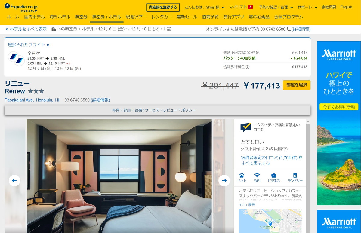 出発1か月前でも、航空券とホテルを合わせて申し込むことで、24,000円以上のパッケージ割引が適用されました!