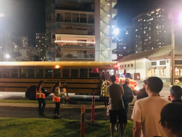 大会無料バス(ホノルル動物園前)まで20分ほど歩くか、スタート地点まで40~50分歩くか。