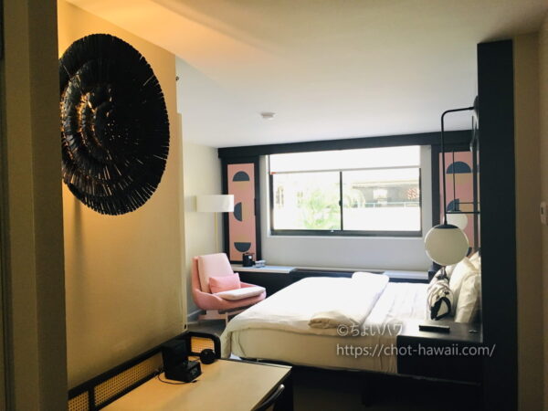 白・黒・ピンクを基調としたスタイリッシュな内装に、大きめサイズのベッドで快適なお部屋です。