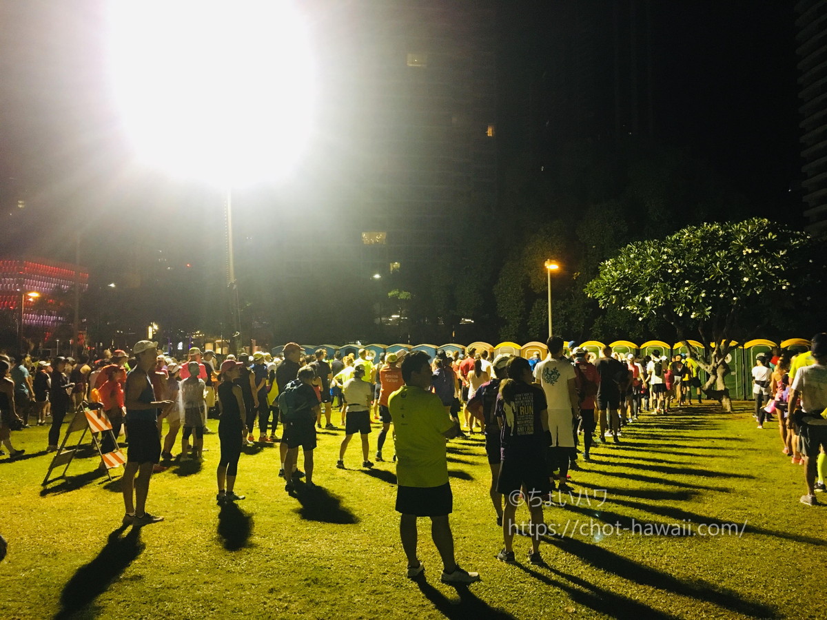ホノルルマラソンは、スタート地点(=アラモアナビーチパーク前)とフィニッシュ地点(=カピオラニ公園)が、別の場所にあります。