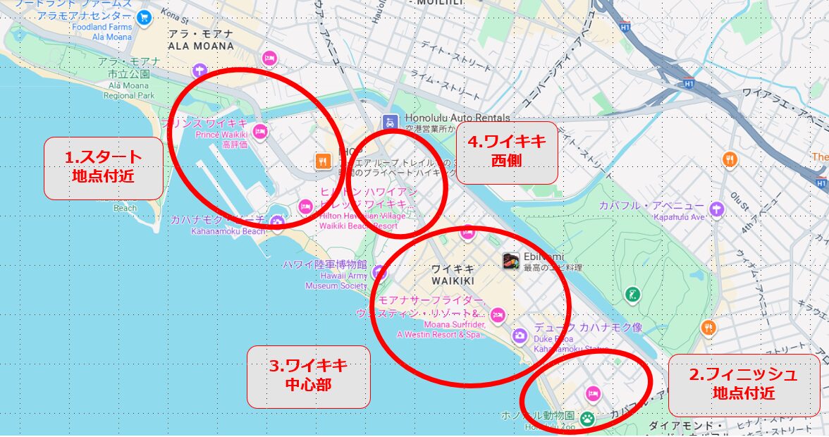 | 1.スタート 地点付近 | 2.フィニッシュ 地点付近 | 3.ワイキキ 中心部 | 4.ワイキキ 西側 | |