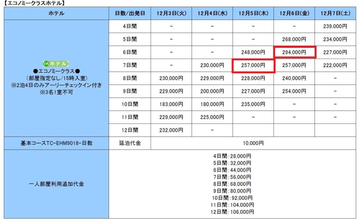 2019年のツアーでは、12月6日金曜発6日間は294,000円、12月5日木曜発7日間は257,000円でした。